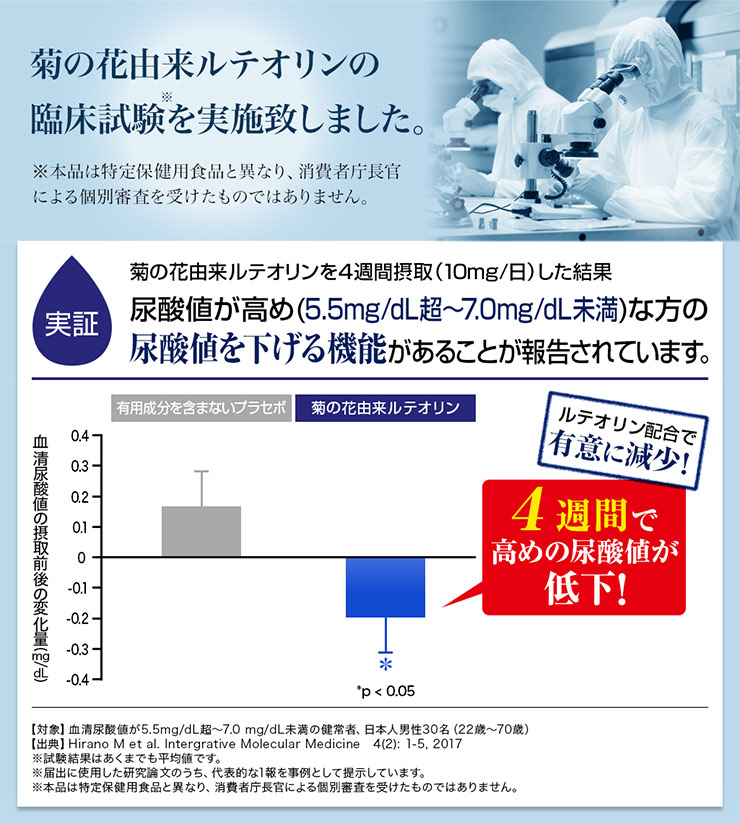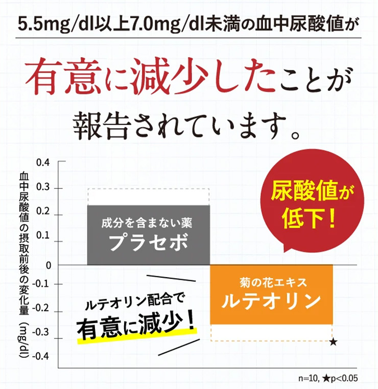 主成分の「ルテオリン」は最短4週間で尿酸の低下が認められています。