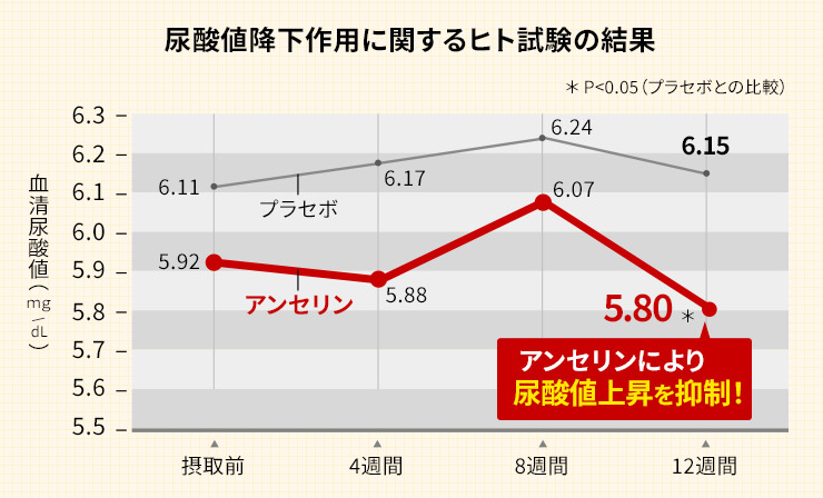 同様に尿酸値の低下が科学的に証明されていますが、 尿酸の排出を促進することができるのはアンセリンのみです。 継続的に服用して、徹底的に尿酸対策をできる『アンセリン配合のサプリ』がおすすめです。