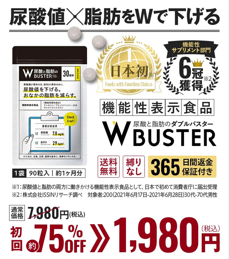 『ダブルバスター』は医学誌に掲載された成分 「アンセリン」と「ブラックジンジャー」を配合し、高めの 尿酸値を下げる働き・尿酸の排出を促進 する働きと肥満気味な方のお腹まわりの 脂肪を減らす働き が証明された機能性表示食品です。